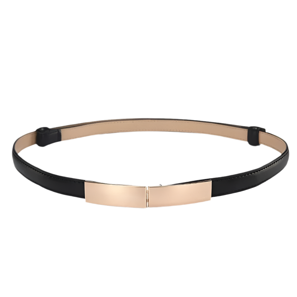 Schmaler Gürtel mit goldener Schnalle und stilvollem Streifenmuster. Einfach zu tragen und ein echter Blickfang, der jedem Outfit einen Hauch von Raffinesse verleiht.