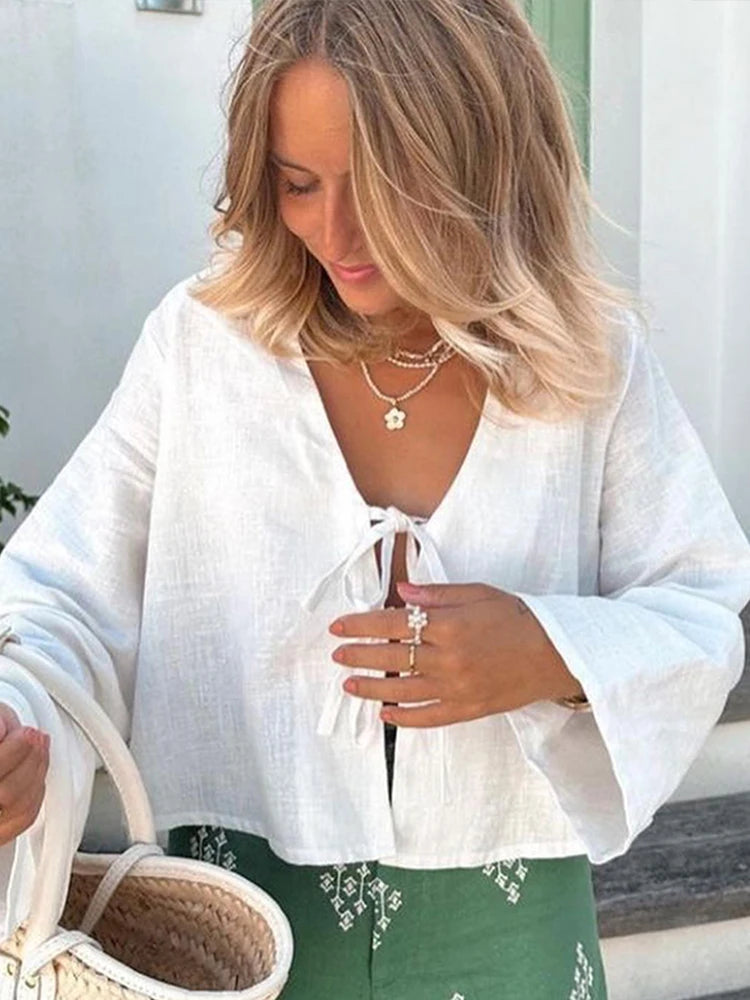 Die Sesly Damenbluse kombiniert lässigen Streetwear-Style mit femininen Akzenten. Der V-Ausschnitt mit Schnürung verleiht der Bluse einen modernen Touch, während die weiten Flare-Ärmel für eine elegante Silhouette sorgen. Das leichte Polyester-Material macht sie ideal für warme Frühlingstage und Sommerabende. Dank des lockeren Schnitts bietet die Bluse ein angenehmes Tragegefühl und lässt sich vielseitig kombinieren – ob zur Jeans für den Alltag oder mit einer Stoffhose für einen eleganten Look.