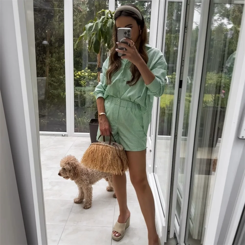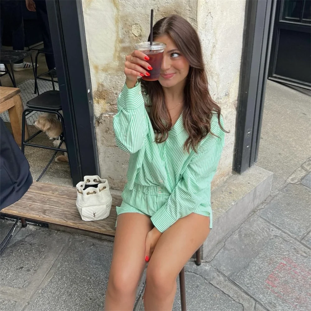 Das Set besteht aus einer weiten Bluse mit Kragen und einer bequemen Shorts mit elastischem Bund.