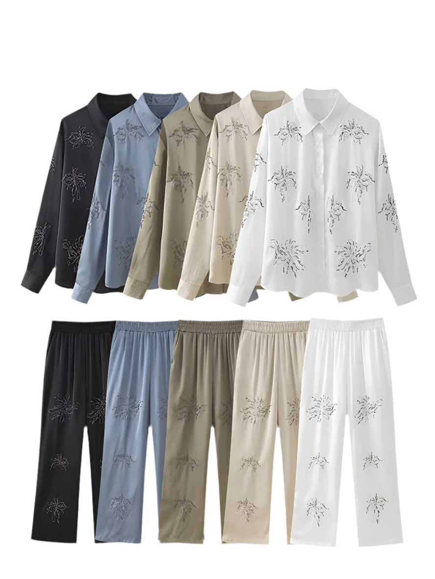 Das Elmara Set bietet dir einen entspannten, modischen Look mit einem Hauch von Eleganz. Die Kombination aus weiten Beinen und einem Turn-Down Kragen macht dieses Outfit zu einem perfekten Begleiter für den Frühling und Sommer.